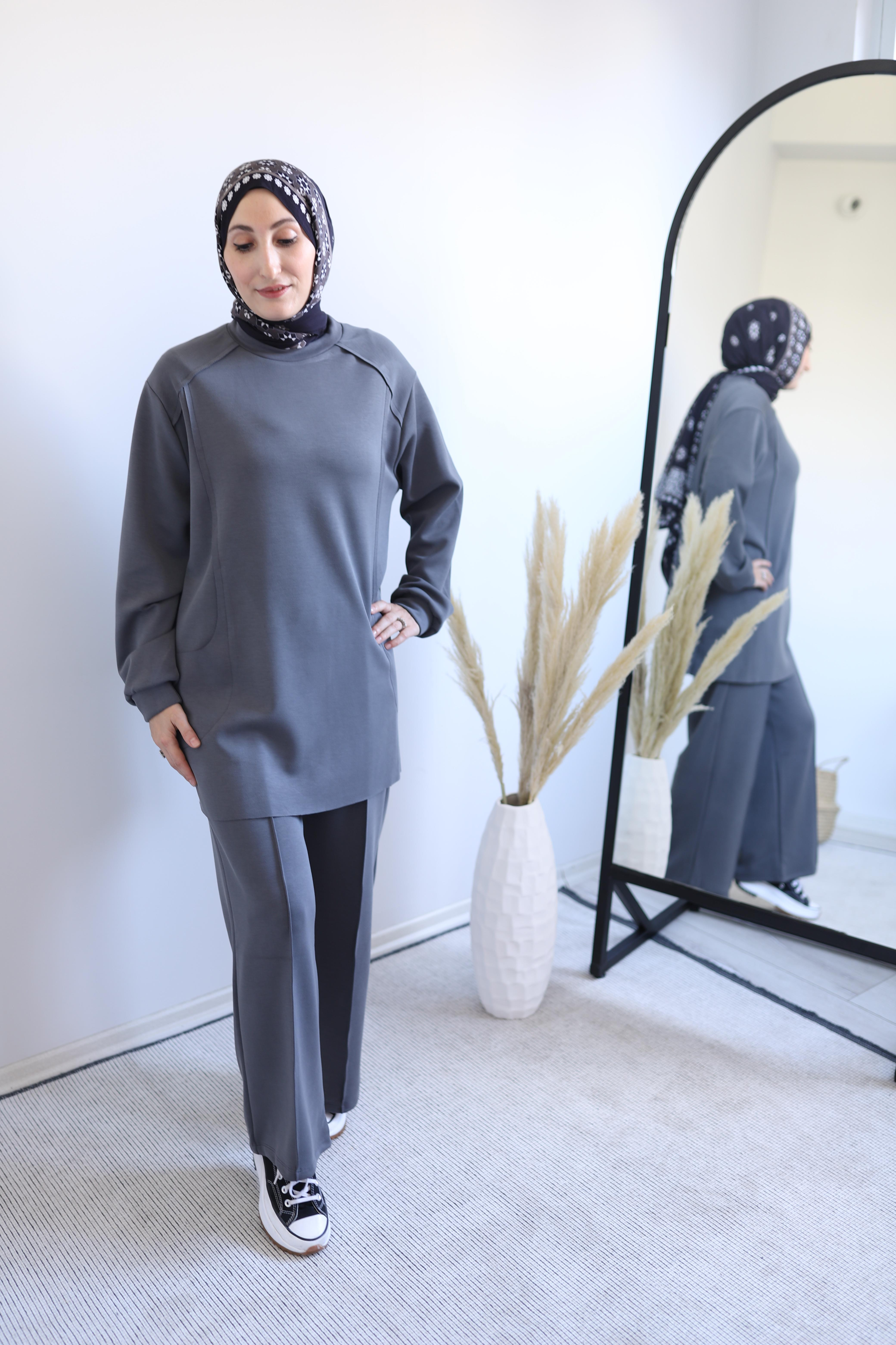 Şıklığı ve rahatlığı bir arada sunan füme takım, modern çizgisiyle günlük stilinize zarif bir dokunuş katıyor. Rahat kesimi sayesinde gün boyu konfor sağlarken, tunik kısmındaki cep detayları takıma spor bir hava kazandırıyor. Geniş paçalı pantolonuyla özgür bir hareket alanı sunan bu takım, hem günlük kombinlerde hem de şık davetlerde rahatlıkla tercih edilebilir.