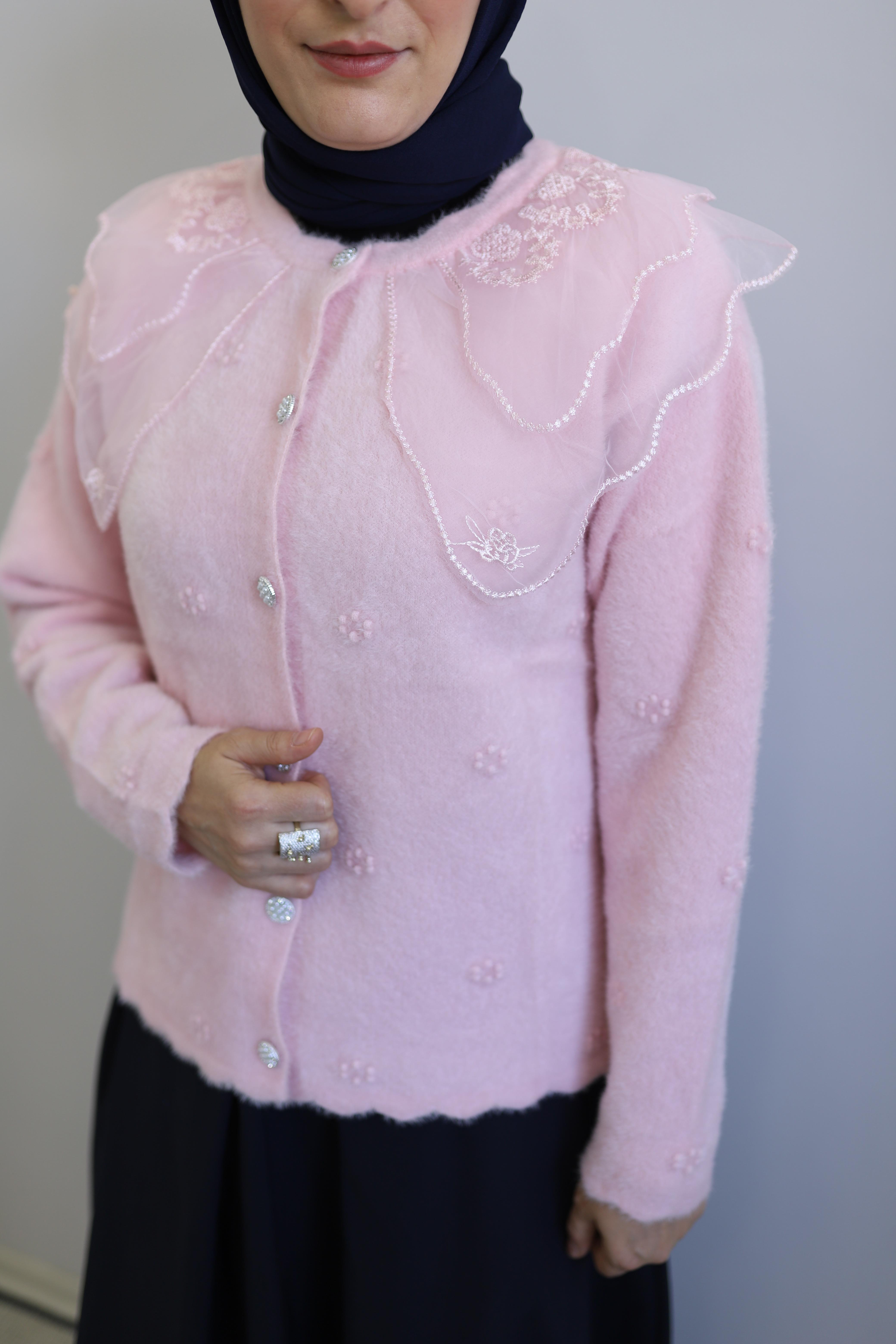 Yumuşacık dokusu ve zarif detaylarıyla dikkat çeken bu pembe hırka, feminen ve romantik bir stil arayanların favorisi olacak. İnci görünümlü düğmeleri, minik kabartma çiçek desenleri ve dantel işlemeli şifon yakası ile klasik hırka tasarımına modern bir dokunuş kazandırıyor.
