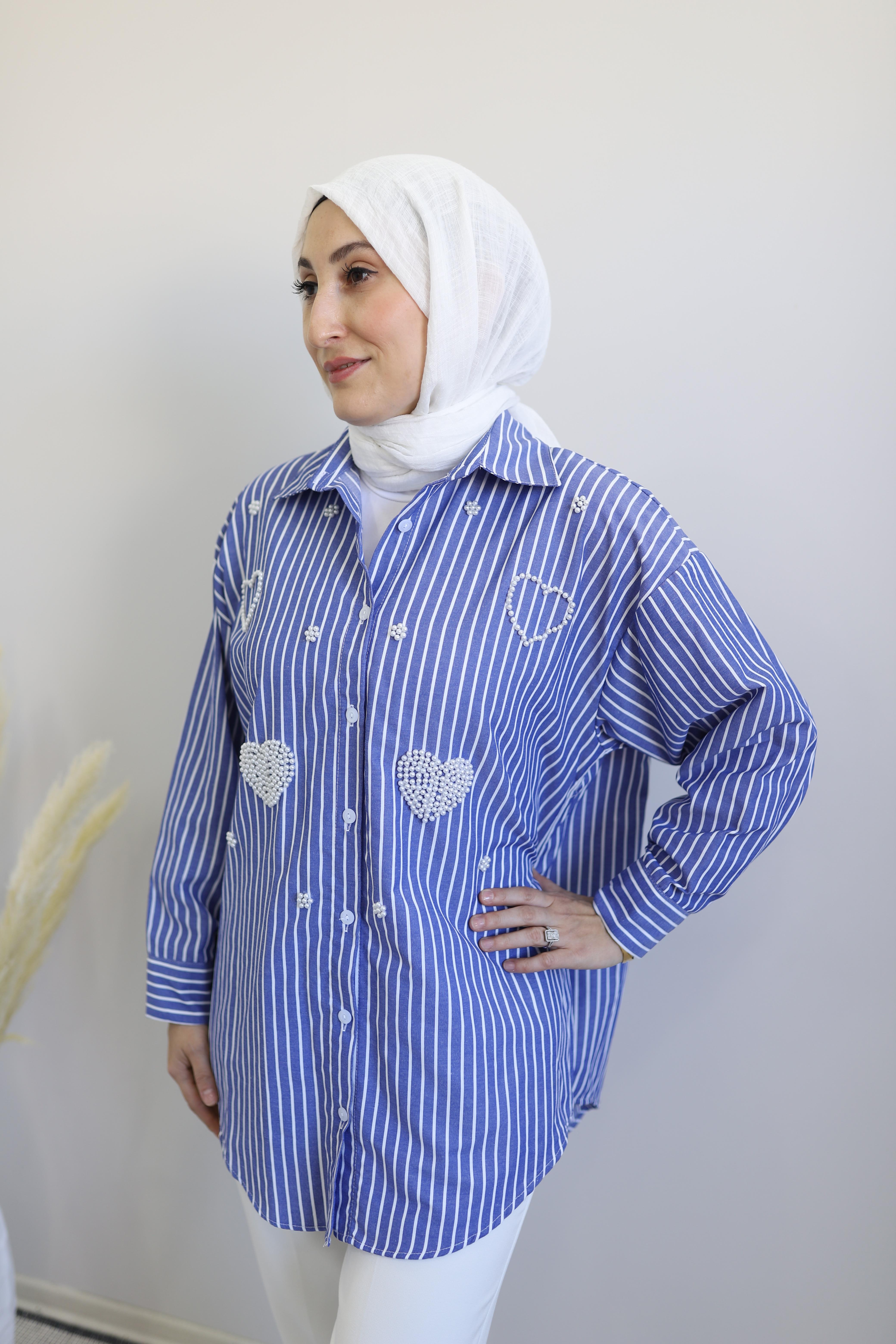Şıklık ve rahatlığı buluşturan bu mavi-beyaz çizgili gömlek, zarif detaylarıyla öne çıkıyor. Rahat kalıbı sayesinde gün boyu konfor sağlarken, ön kısmındaki inci işlemeli kalp ve çiçek detayları feminen ve şık bir dokunuş katıyor.