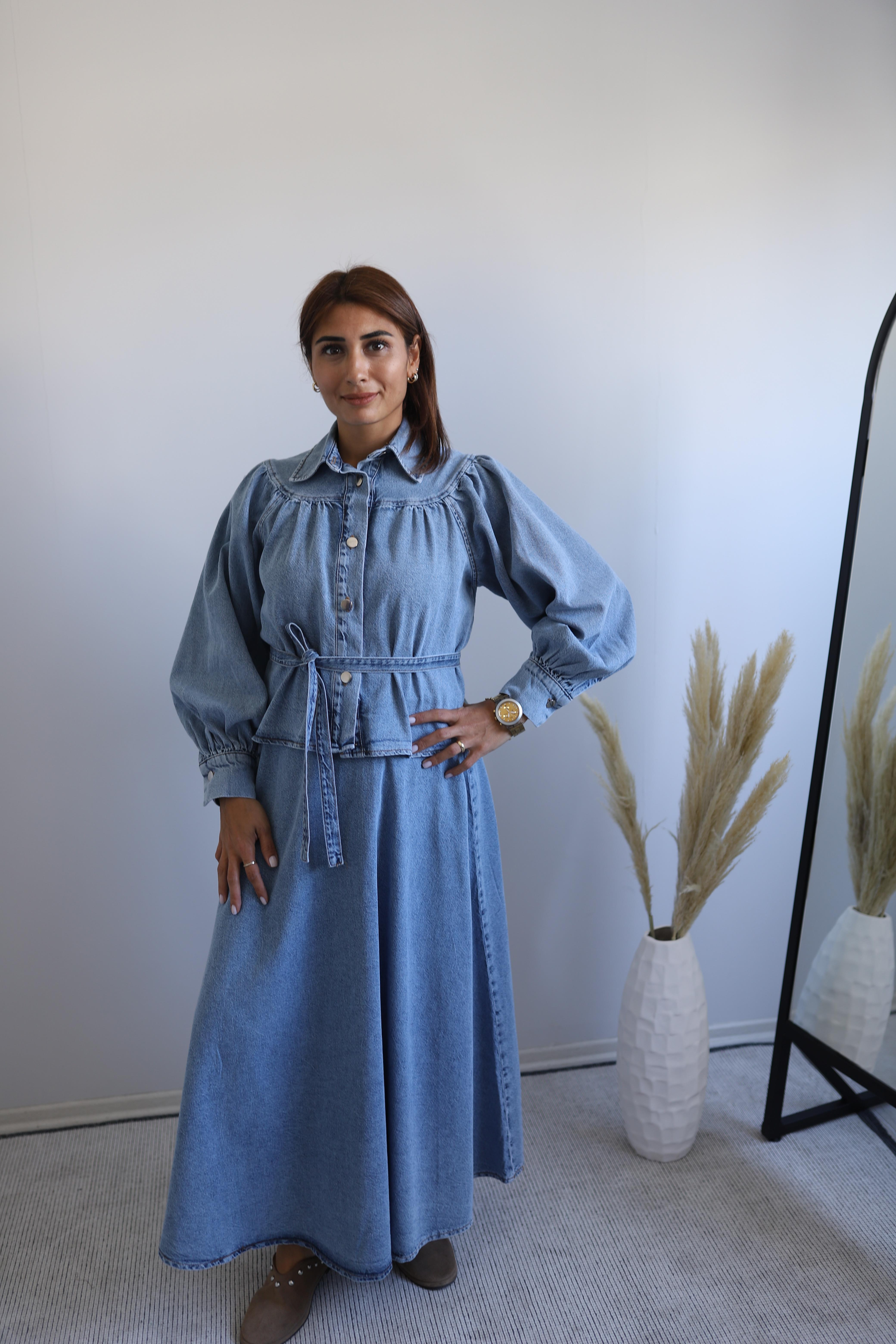 Şıklığı ve rahatlığı bir arada sunan kot elbise, modern detaylarıyla gardırobunuzun vazgeçilmez parçalarından olacak. Balon kol tasarımıyla feminen bir duruş kazandırırken, önden düğmeli formu ve beldeki kuşak detayı ile hem şıklığı hem de rahat kullanımı ön plana çıkarıyor. Gündelik hayatta konforlu bir stil yaratmak isteyenler için ideal bir seçimdir.