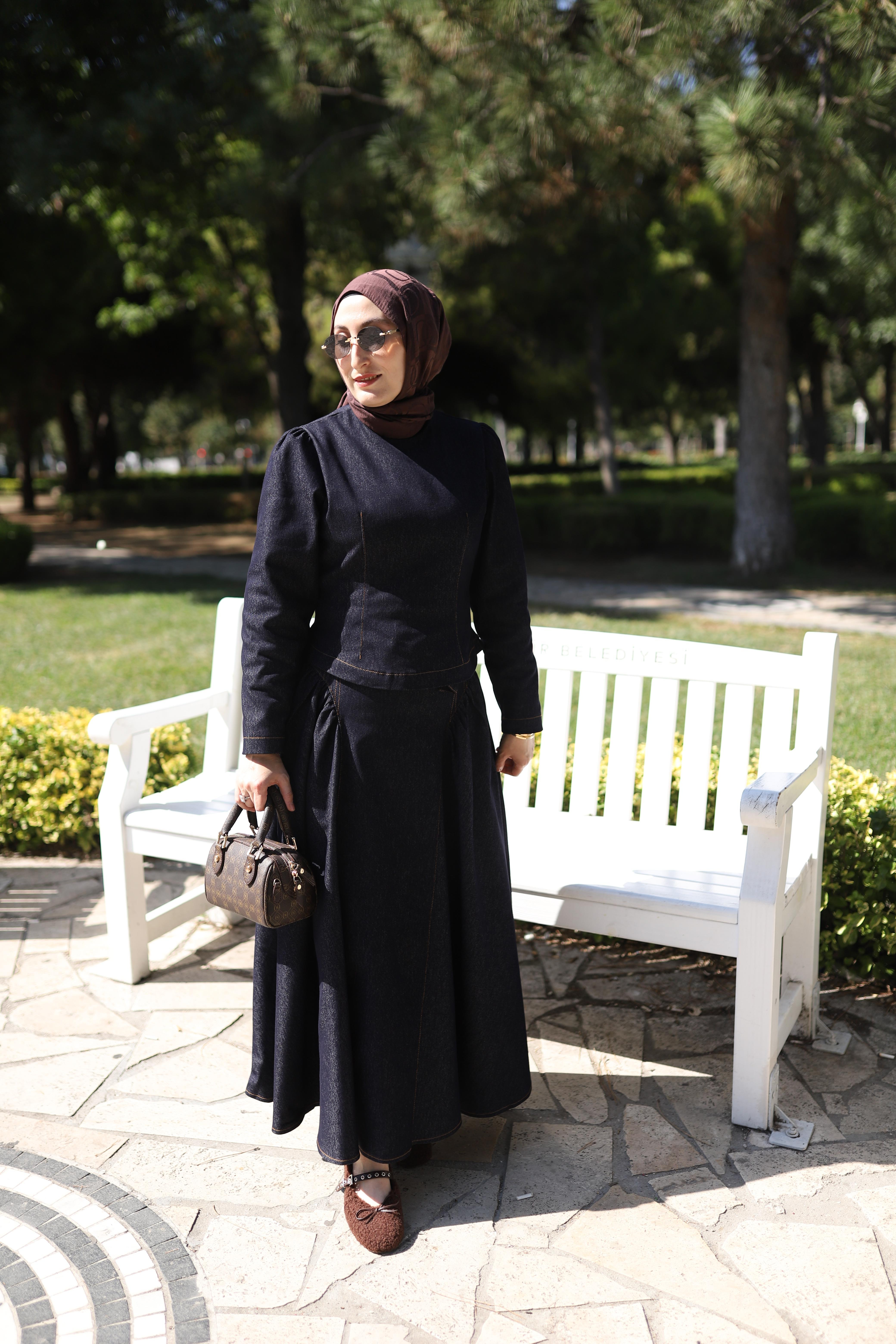 Modern çizgiler ve zamansız şıklığı bir araya getiren bu kot lacivert takım, şık ve rahat tasarımıyla öne çıkıyor. Üst kısmında kullanılan düz ve sade kesim, alt parçada ise pile detaylı uzun etekle tamamlanarak zarif bir siluet oluşturuyor. Dayanıklı kot kumaşı günlük kullanıma uygunken, lacivert tonuyla hem klasik hem de modern bir tarz sunuyor.