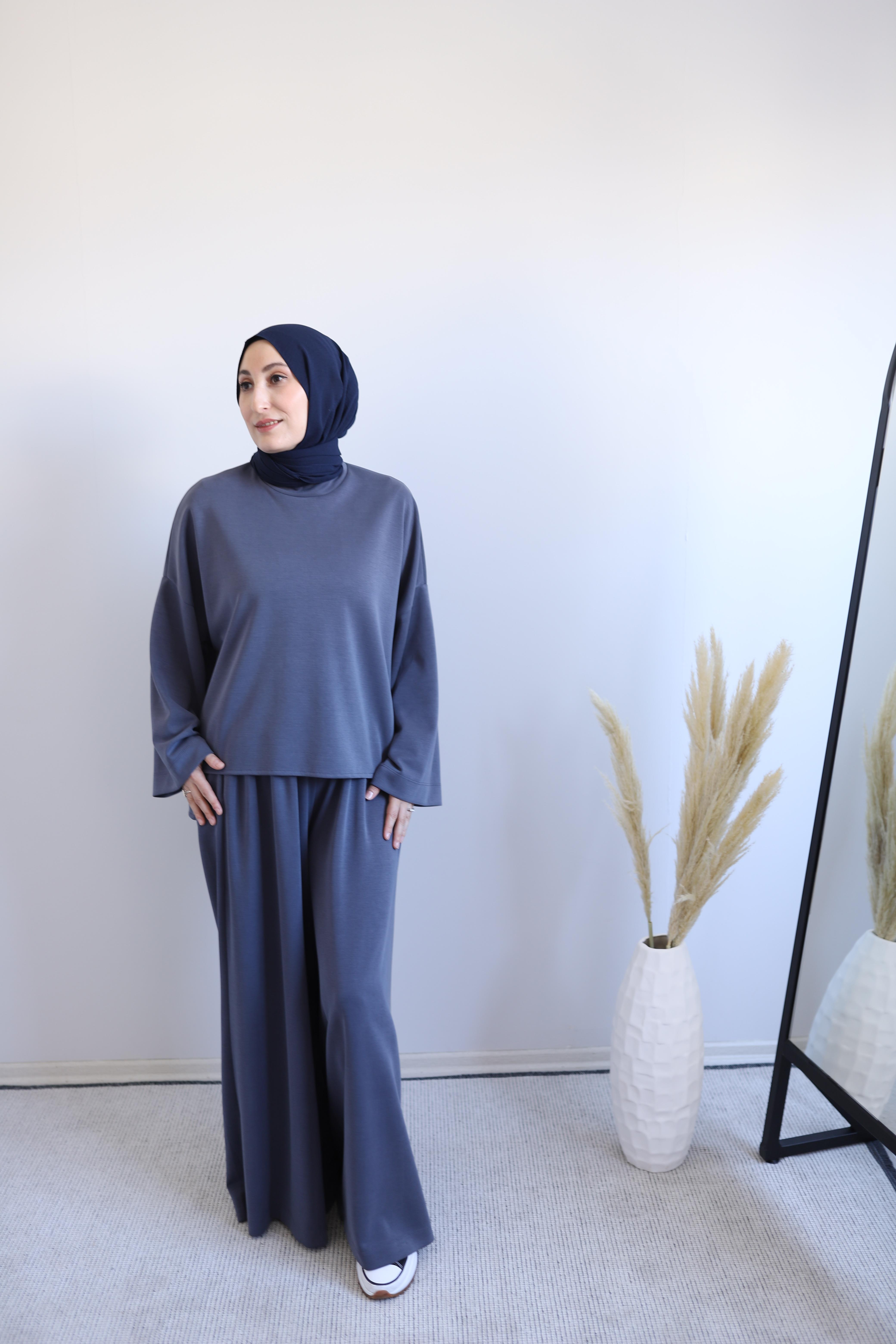 Zarif tasarımı ve rahat kalıbıyla öne çıkan bu lacivert takım, hem günlük kullanımda hem de özel davetlerde stil sahibi bir görünüm sunar. Oversize üst parçası, modern çizgisiyle konforu ön plana çıkarırken; geniş paça altı ise özgürce hareket etmenizi sağlar. Nefes alan kumaşı sayesinde gün boyu rahatlık sunan takım, şıklığı ve sadeliği bir arada arayanlar için ideal bir seçimdir.