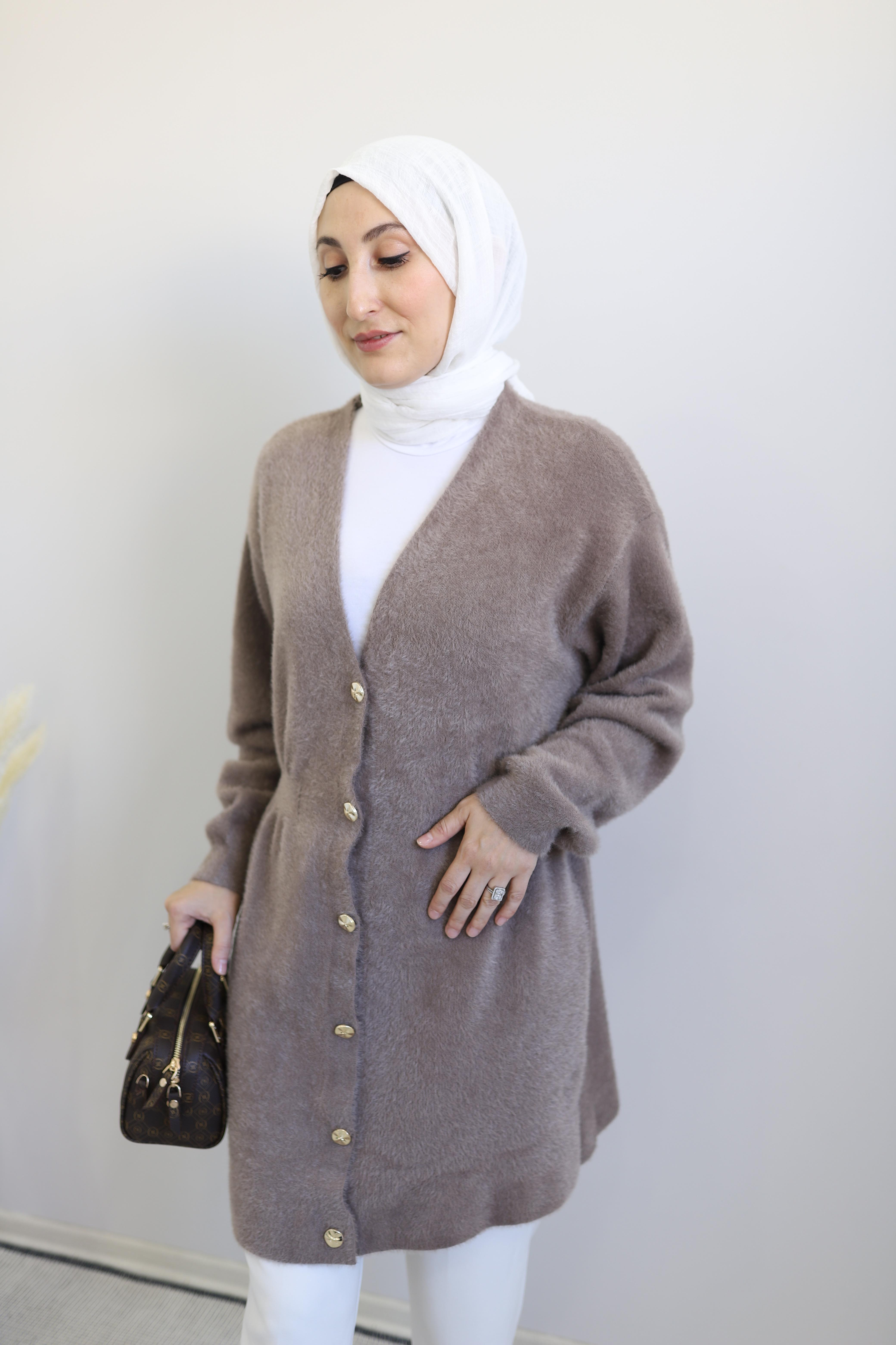 Zarif ve modern tarzı bir arada sunan kahverengi hırka, yumuşacık dokusu ile hem şık hem de konforlu bir kullanım sağlıyor. Altın renk düğme detayları, tasarıma zarafet katarken ince kesimiyle günlük ve özel kombinlerde rahatlıkla tercih edilebiliyor. Düşük omuz yapısı ve rahat kalıbı sayesinde gün boyu konfor sunar. Kahverengi tonunun sıcaklığı ise her renkle kolayca uyum sağlayarak gardırobunuzun favori parçalarından biri olur.