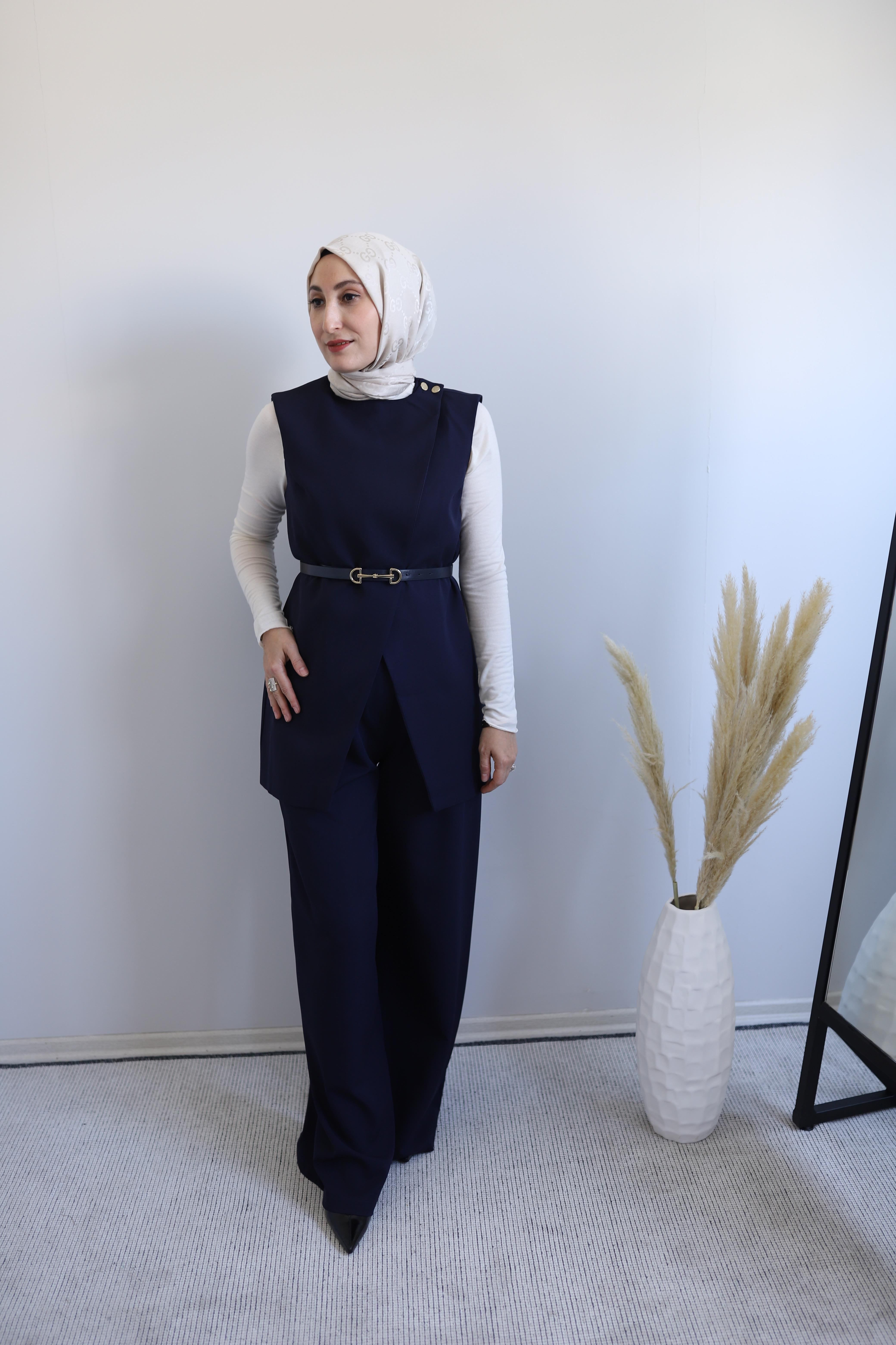 Modern ve zarif çizgileriyle dikkat çeken lacivert pantolonlu takım, şıklığı ve rahatlığı bir arada sunuyor. Üst kısmında asimetrik kesim detayı ve ince kemeriyle vücuda hoş bir form kazandırırken, geniş paçalı pantolonu gün boyu konfor sağlıyor. Hem iş hayatında hem de özel davetlerde tercih edebileceğiniz bu takım, minimal tasarımıyla her stile kolayca uyum sağlar.